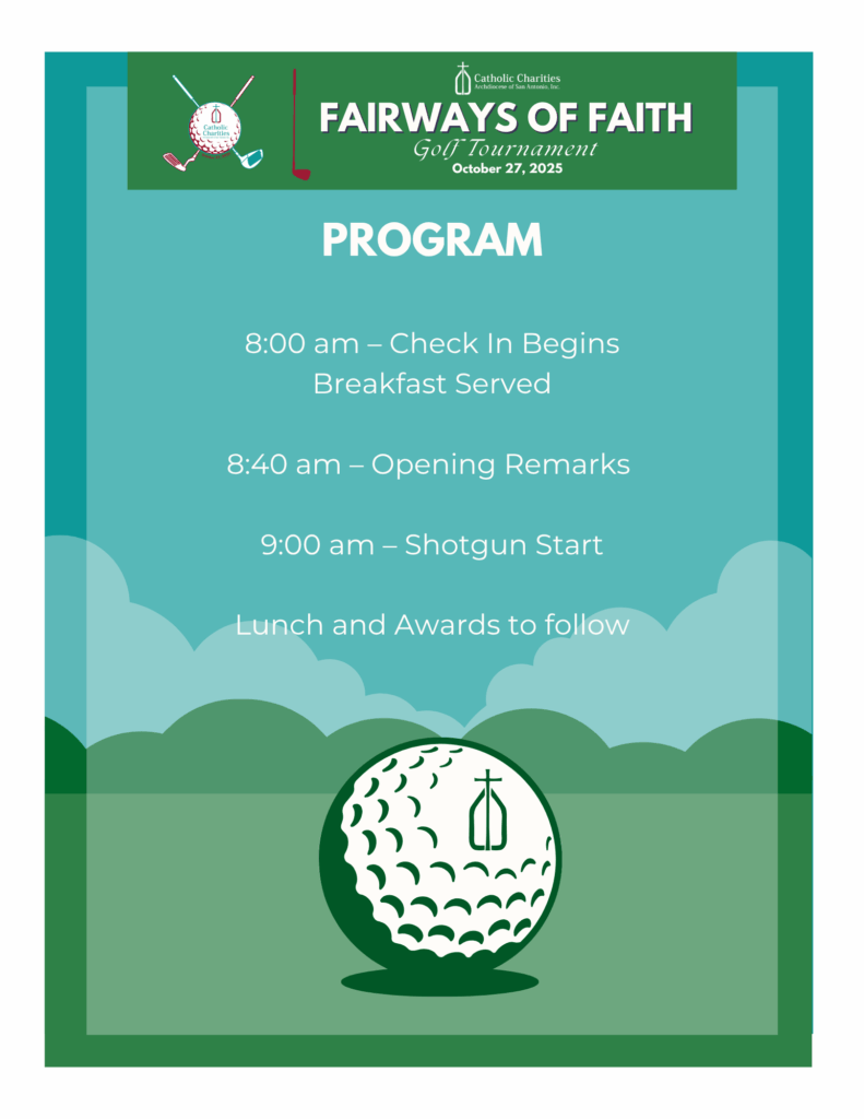 Catholic Charities invites you to its third annual Fairways of Faith Golf Tournament on October 27, 2025, 8:00 am at Oak Hills Country Club. Bring your family and friends and enjoy a day at this premier golfing destination in San Antonio’s Southwest Texas Medical Center. Start the day with tacos and end with a trophy presentation the size of TEXAS. It’s guaranteed to be a fun-filled day as we enjoy fellowship, golf, and lunch.